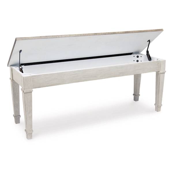 This piano-style bench offers coastal chic charm with a distressed grayish-white finish, hidden under-seat storage, and durable construction, making it a stylish and practical addition to small spaces.