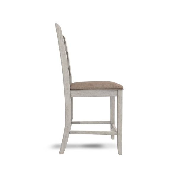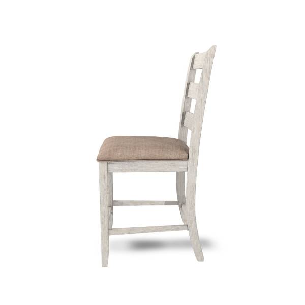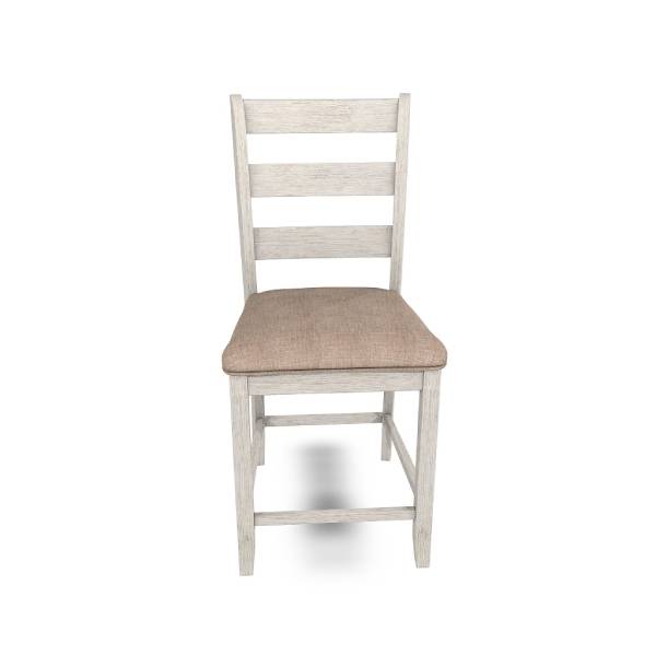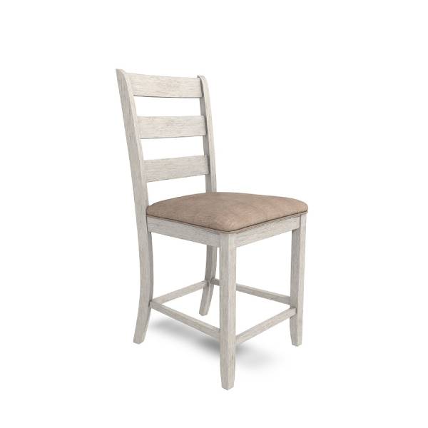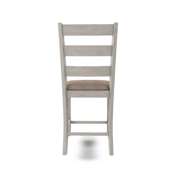 Elevate your small space living with this upholstered bar stool, a perfect blend of coastal chic and modern farmhouse design. The classic ladderback styling, combined with a grayish white finish with a rub-through effect, gives this stool a charming, timeworn appeal.