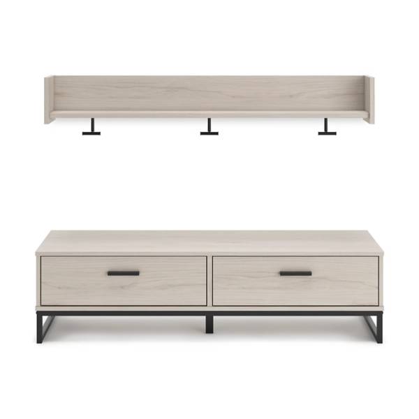 Elevate your entryway or mudroom with this modern storage bench and coat rack set, designed for both functionality and style. Spacious drawers in the bench and sturdy hooks with an open shelf on the wall-mounted rack provide an ideal solution for organizing hats, scarves, and outdoor gear. Finished in a natural oak-inspired tone, the sleek design is complemented by pewter-tone metal sled legs, handles, and hooks. Durable materials and smooth-gliding drawers ensure longevity, while a wall mounting bracket simplifies installation. Assembly required.