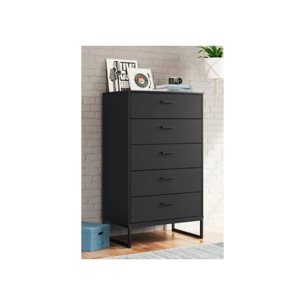 Add a touch of sophistication to your bedroom with the Socalle Five Drawer Chest, available exclusively at Teletime. This striking piece combines a warm, alluring design with contemporary elegance, making it a perfect fit for modern living. The matte black finish with a replicated wood grain brings a refined yet edgy charm, while dark pewter-tone handles and metal legs add a sleek finishing touch.