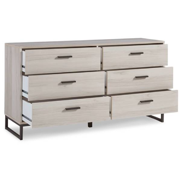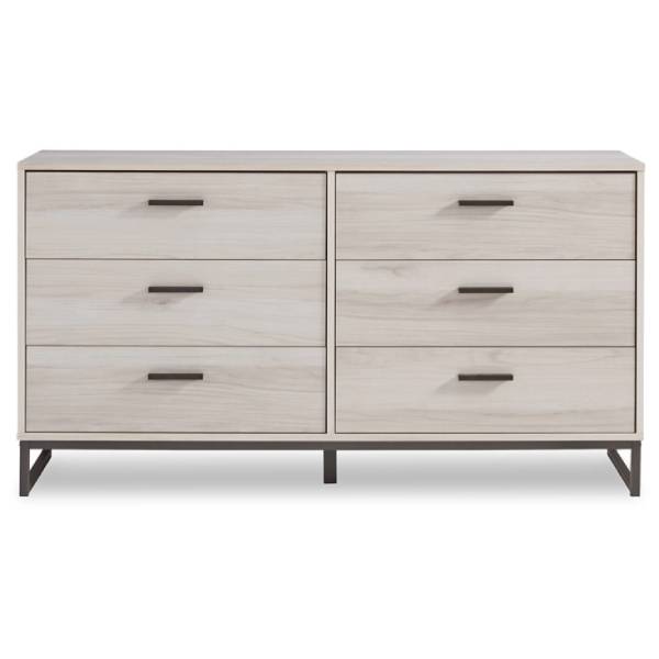The dresser offers six spacious, smooth-gliding drawers, providing ample storage to keep your wardrobe neatly organized. Each drawer is thoughtfully designed with vinyl-wrapped sides and backs to ensure lasting durability, while dark pewter-tone pulls add a sophisticated contrast to the light finish. Crafted from engineered wood and decorative laminate, it strikes an ideal balance between affordability and long-lasting quality. With its clean lines and functional design, the Socalle dresser effortlessly transforms your bedroom into a stylish and organized sanctuary, only at Teletime.