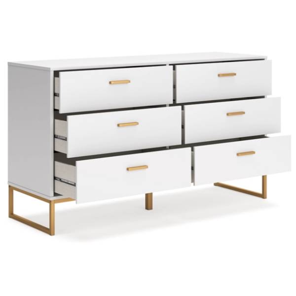 Elevate your bedroom with the Socalle Six Drawer Dresser, exclusively at Teletime, where contemporary design meets timeless elegance. This dresser features a chic matte white finish complemented by stunning goldtone accents, creating a sophisticated statement piece that seamlessly blends modern style with natural living. The sleek drawer pulls and sturdy metal legs, both finished in goldtone, add a touch of glamour, making it a perfect addition to any contemporary or minimalist space.