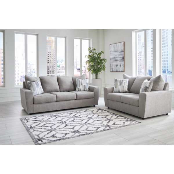 The Stairatt Sofa and Loveseat set blends style and functionality with its clean lines and neutral upholstery. Plush cushions and supportive seating offer a comfortable experience for everyday lounging. A modern look makes it perfect for contemporary living spaces.