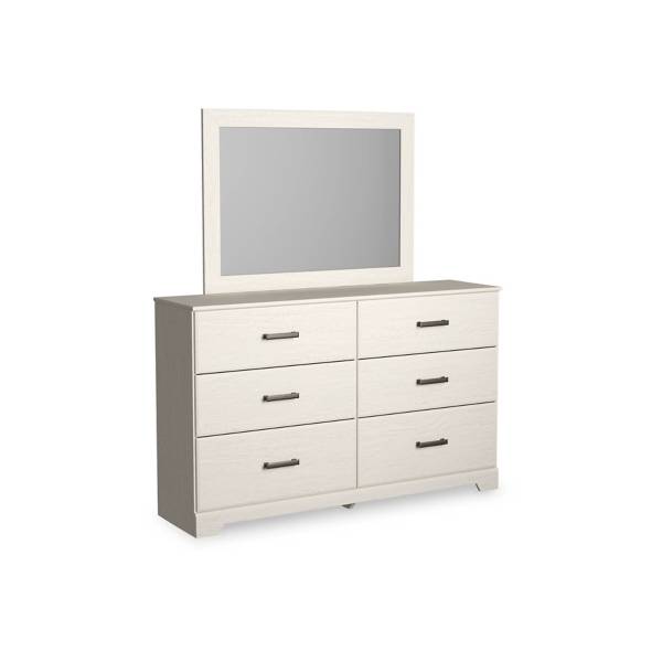 The Stelsie Dresser and Mirror brings a fresh, modern look with its bright white finish and sleek silhouette.Its streamlined design offers spacious drawer storage to keep your space effortlessly organized.Crafted for lasting durability, it’s a perfect blend of style and practicality for contemporary bedrooms.