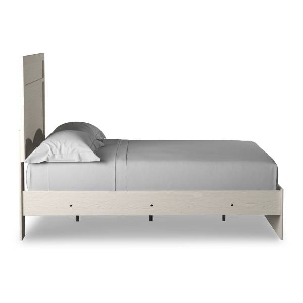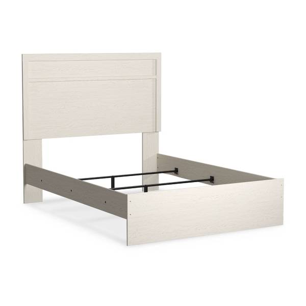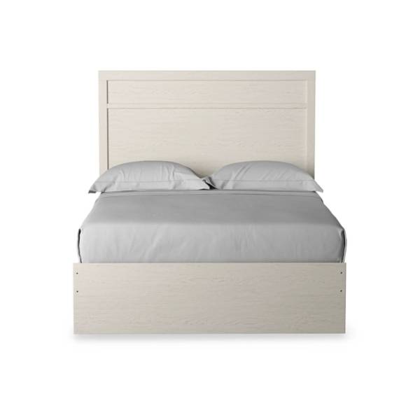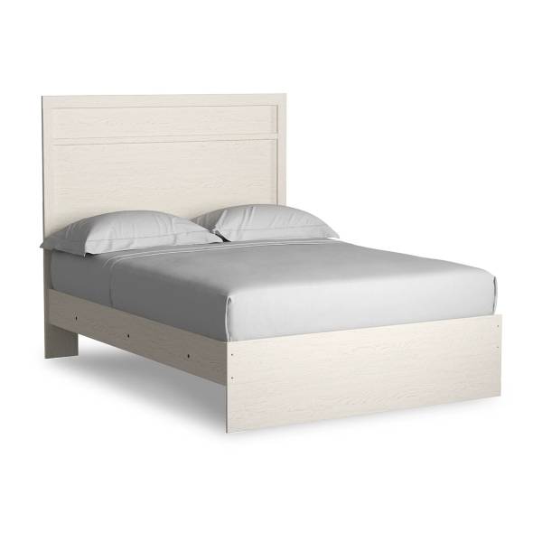 The Stelsie Full Panel Bed introduces a sleek and contemporary charm to your bedroom with its clean lines and minimalist appeal. Its crisp white finish, enhanced by a subtle replicated wood grain, creates a fresh and versatile aesthetic that harmonizes beautifully with a variety of furniture styles and color palettes. The unadorned, streamlined profile is thoughtfully accented by plank-style moulding on the headboard, adding texture and depth while showcasing the beauty of simple, understated details.