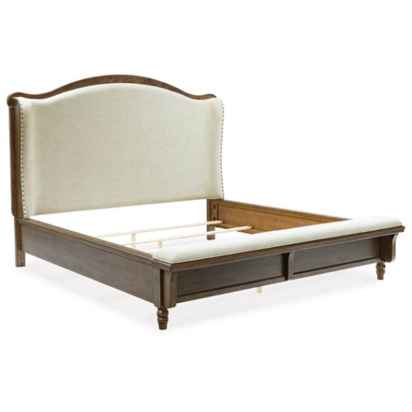 Crafted from hardwood solids, veneers, and MDF substrates, this bed is built to last, ensuring both strength and durability. The rich brown finish complements the polyester upholstery, while the nailhead trim around the headboard adds a hint of classic detail. The turned feet contribute to the bed's timeless charm, offering a balanced design that feels both traditional and contemporary.