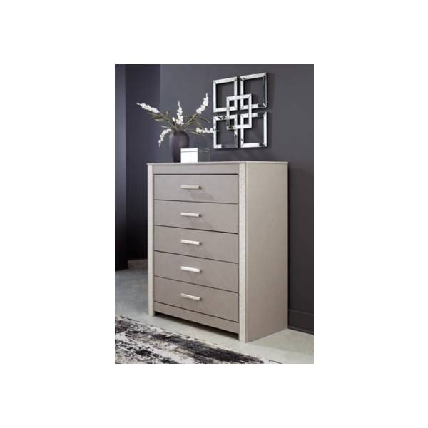 Bring sleek, bold contemporary style into your bedroom with the Surancha Five Drawer Wide Chest, exclusively available at Teletime. This striking piece features glamorous glitter accents and a refined gray finish that mimics the look of leather grain, creating a sophisticated aesthetic that commands attention. The streamlined design is elevated by large-scale linear handles in a luxurious champagne chrome tone, adding a touch of modern elegance.
