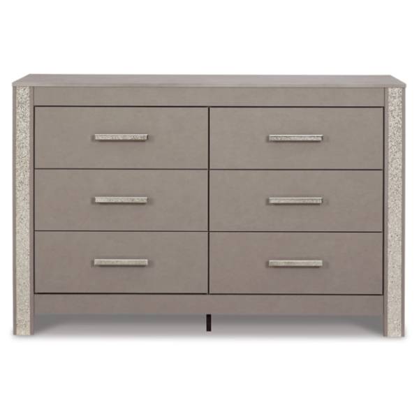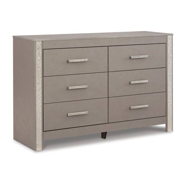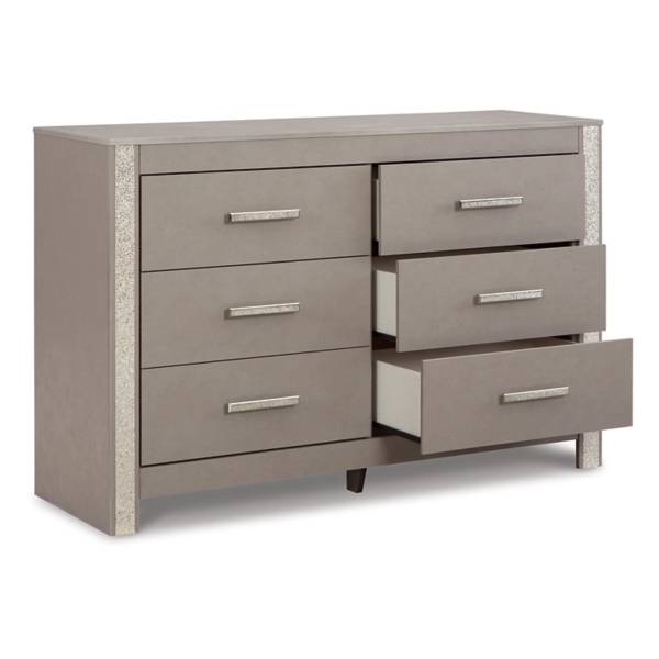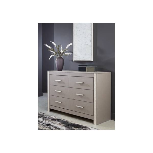 Elevate your bedroom with the bold, contemporary elegance of the Surancha Six Drawer Dresser, available at Teletime. Its sleek design is accentuated by a subtle gray finish over a replicated leather grain, offering a refined texture that exudes modern sophistication. Glitter panel accents add a touch of glamour, while the large-scale linear handles in a champagne chrome-tone finish perfectly complement the streamlined aesthetic, creating a stunning focal point for your space.