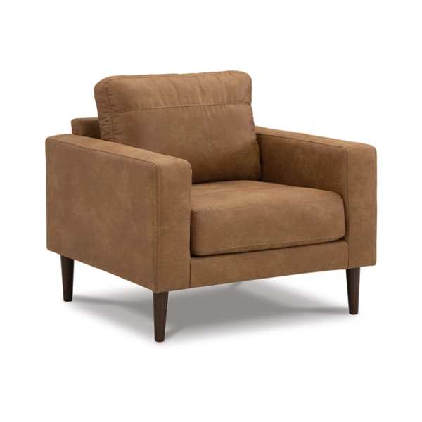 The Telora Chair and Ottoman set is a stylish nod to retro aesthetics, featuring warm caramel faux leather and ultra-linear silhouettes for a contemporary touch. Designed for compact spaces, this small-scale duo brings both function and flair, making it a versatile addition to modern boho and transitional interiors. The chair's loose cushions provide plush comfort, while the durable platform foundation ensures long-lasting support without sagging. The matching ottoman complements the chair with firm cushioning and accent legs finished in faux wood, creating a cohesive and sophisticated look. Perfect for those seeking a budget-friendly yet chic seating option.