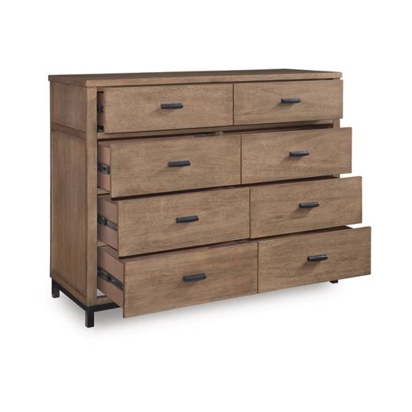 The dresser features eight spacious, smooth-gliding drawers with fully finished interiors, providing ample room for clothing and linens. Built with dovetail construction and heavy-duty ball-bearing side glides, the drawers ensure long-lasting durability and effortless access. The top drawers are thoughtfully lined with felt, making them ideal for delicate items. Metal bar pulls add a modern touch, accentuating the piece’s clean lines and mixed-material appeal. Whether you’re looking to refresh your bedroom decor or add practical storage, the Tomtyn dresser combines sophistication, versatility, and quality to meet your needs.