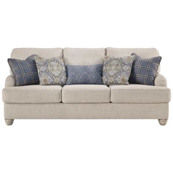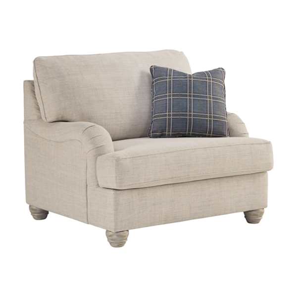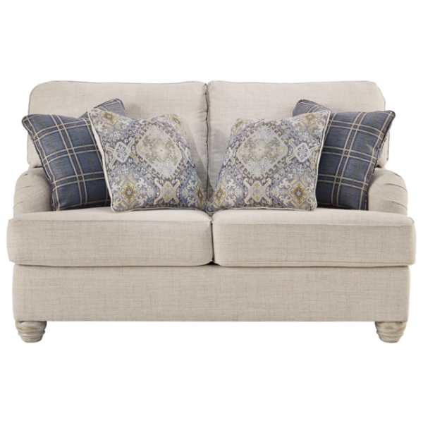 The exposed turned feet with a faux wood finish add a refined touch to the overall aesthetic, enhancing the set's modern appeal. The neutral upholstery is not only visually appealing but also easy to clean and maintain, making it suitable for households with children or pets. The platform foundation system incorporated into the sofa and loveseat resists sagging better than traditional spring systems, offering consistent support and maintaining a wrinkle-free appearance over time. This feature ensures that the cushions retain their shape and comfort, even after years of use.