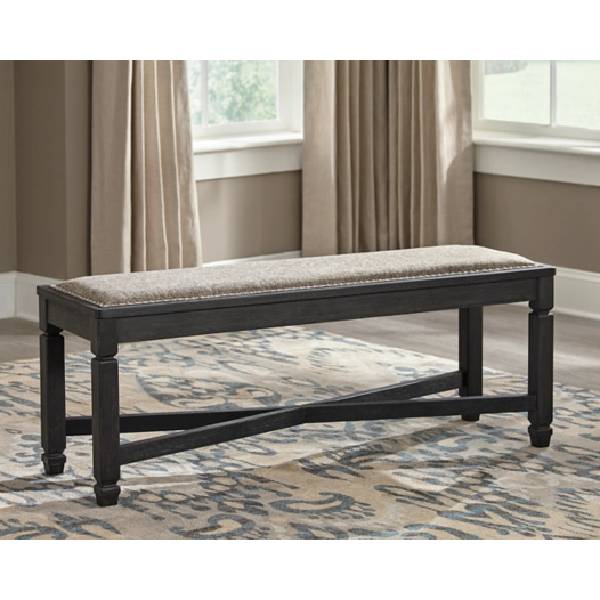 Elevate your dining experience with this inviting upholstered dining room bench. Crafted with a sturdy foundation featuring an X-shaped stretcher and tapered legs, it boasts a textured black finish that adds a touch of rustic charm. The bench is upholstered in heavily woven polyester fabric, offering a quality feel and a comfortable seating experience. Decorative silvertone nailhead trim enhances its urban farmhouse style without overwhelming the design. Whether for family gatherings or casual meals, this bench brings a trend-right look to the heart of your home.
