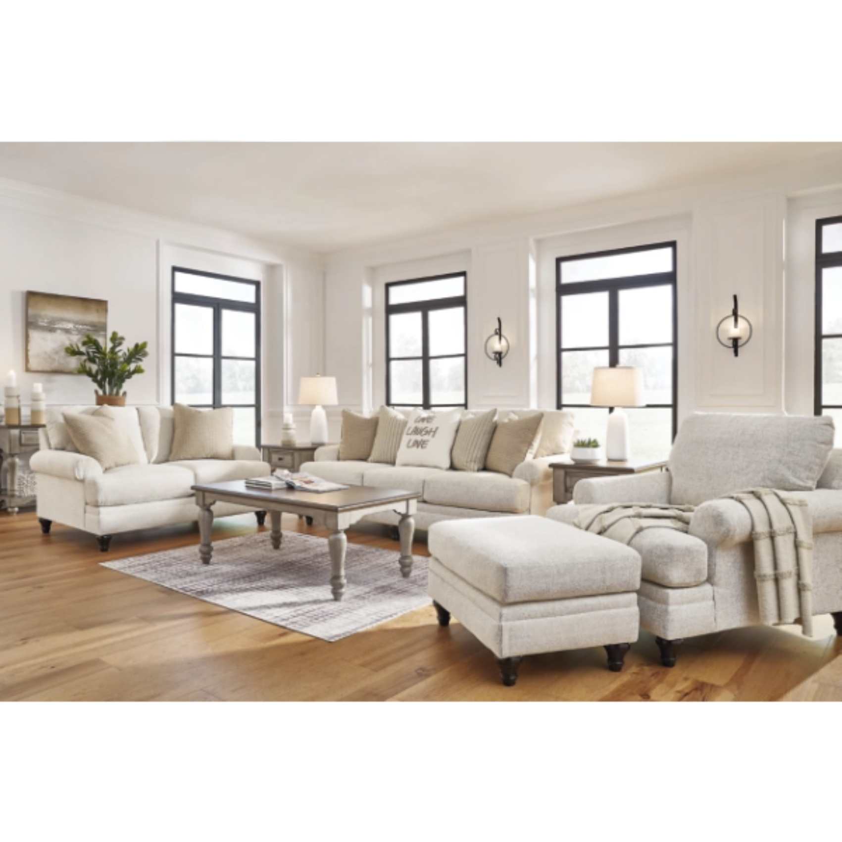 The Valerani Sofa, Loveseat, Chair, and Ottoman set (SKU - PKG015041) is designed for discerning individuals who appreciate the perfect blend of contemporary aesthetics and superior comfort. This versatile collection is an ideal addition to any living space, offering a harmonious mix of modern design elements and practical functionality. The Valerani set boasts a sleek, streamlined silhouette complemented by plush cushioning and refined detailing, ensuring that each piece not only captivates the eye but also provides long-lasting support.