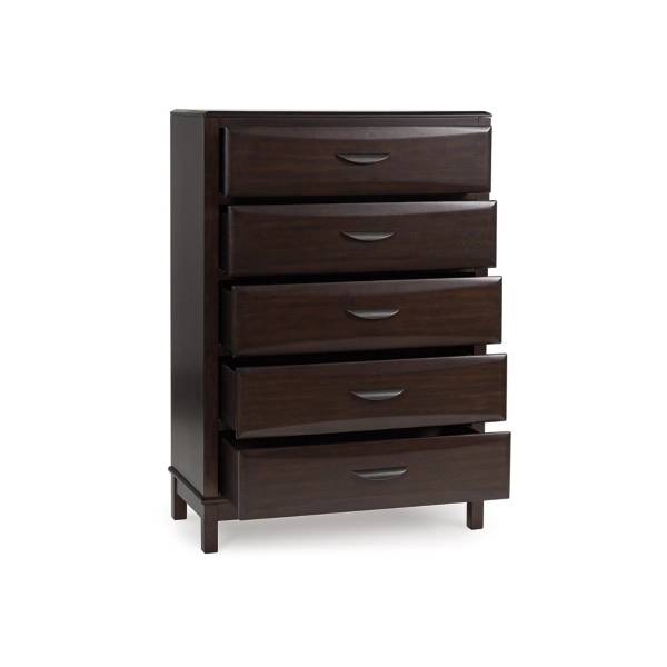 Expertly crafted from select solid wood components, engineered wood veneer, and MDF substrates, this chest offers a sturdy build designed to stand the test of time. Its five spacious drawers, including a felt-lined top drawer for delicate items, provide ample room to organize clothing and essentials. Smooth-gliding drawer mechanisms, complete with dovetail construction and metal center mount guides, ensure effortless access and lasting durability.