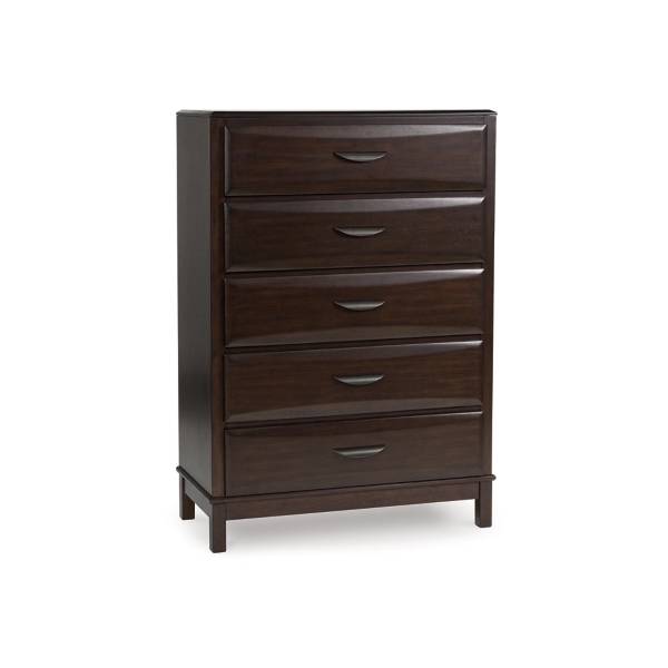 The Vanmore Five Drawer Chest brings sophisticated charm and smart storage to your bedroom space. With its rich merlot finish and modern design, this piece effortlessly balances style and function, making it a must-have for contemporary living. The sleek, contoured drawer fronts, paired with chic metal bar pulls, lend a refined metropolitan appeal that enhances any décor theme.