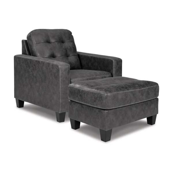 The Venaldi Chair and Ottoman set is the epitome of ultra-contemporary style, designed for those who appreciate sleek, modern aesthetics with a hint of mid-century charm. Featuring clean-lined track arms and tufted box cushions, this set blends sophistication with ultimate comfort. Upholstered in gunmetal gray faux leather, it delivers the cool, weathered look of genuine leather while offering a soft and inviting feel.