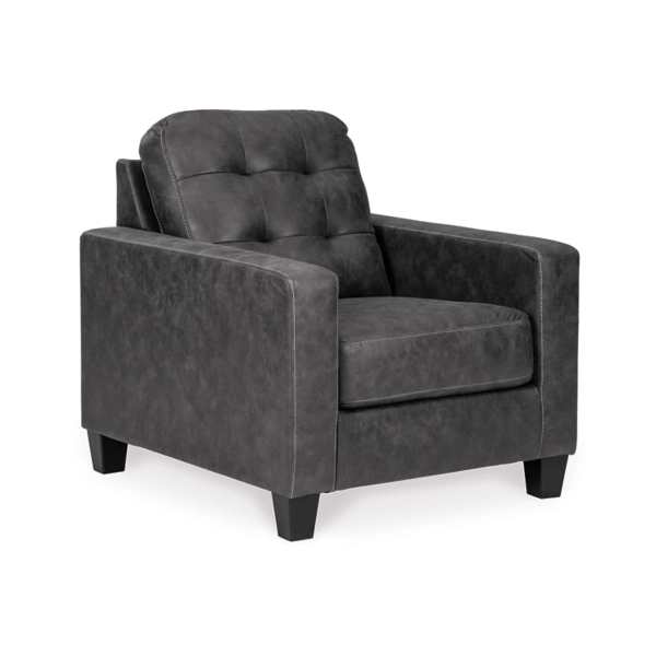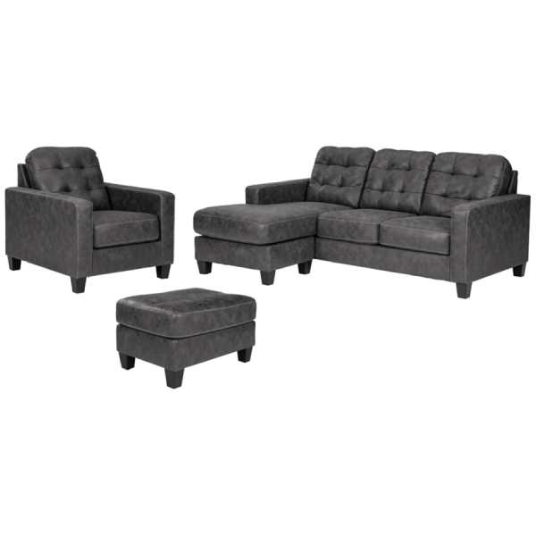 The Venaldi Sofa Chaise, Chair, and Ottoman (SKU - PKG002375) bring a sleek and sophisticated feel to any living space. With faux leather upholstery in a gunmetal gray finish, this set delivers modern style with a touch of elegance. The tufted seat cushions enhance the contemporary aesthetic, while the high-resiliency foam cushions provide lasting comfort. A corner-blocked frame ensures durability, and the matching ottoman adds versatility, making it a perfect blend of style and functionality.