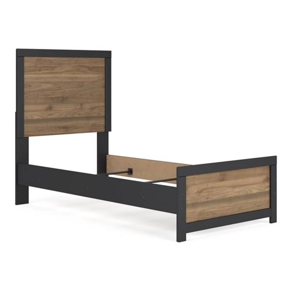 The Vertani Twin Panel Bed brings a blend of relaxed charm and modern sophistication to your bedroom, making it an ideal choice for any space. Its elegant two-tone design features a matte black finish paired with a rich honey brown replicated walnut grain, offering a versatile and contemporary aesthetic that complements various décor styles. This understated yet stylish piece effortlessly enhances the ambiance of your sleeping area.