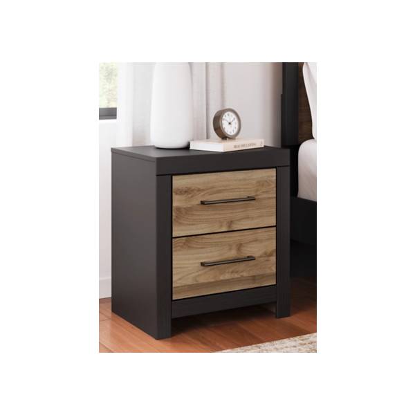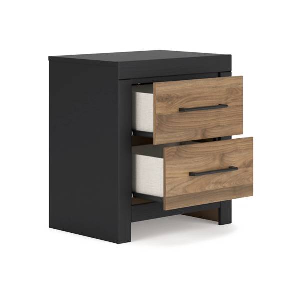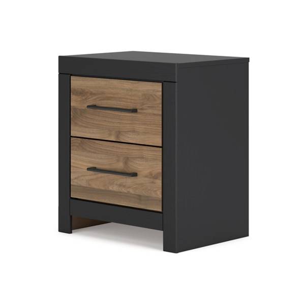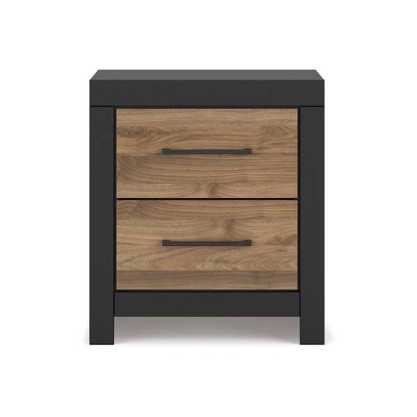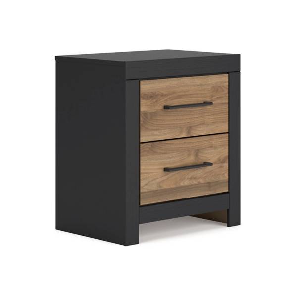 Add a bold touch of contemporary elegance to your bedroom with the Vertani Two Drawer Nightstand, available exclusively at Teletime. This nightstand effortlessly blends modern functionality with a relaxed, sophisticated design. The two-tone finish combines a rich honey brown replicated walnut grain with a sleek matte black base, creating a visually striking contrast that adds warmth and style to your space.