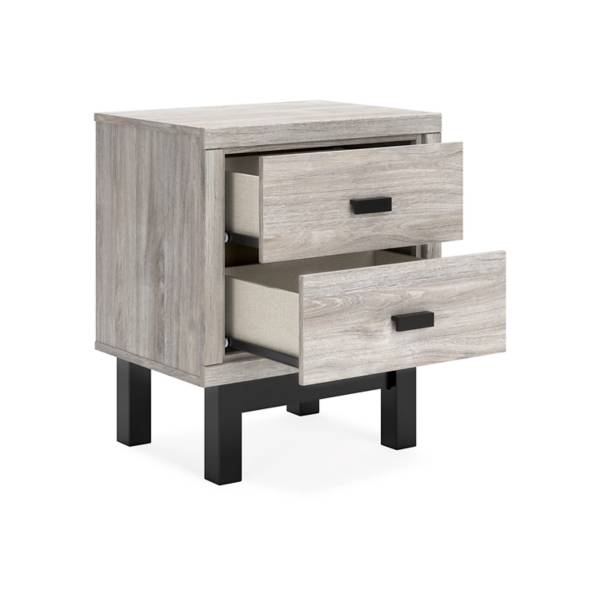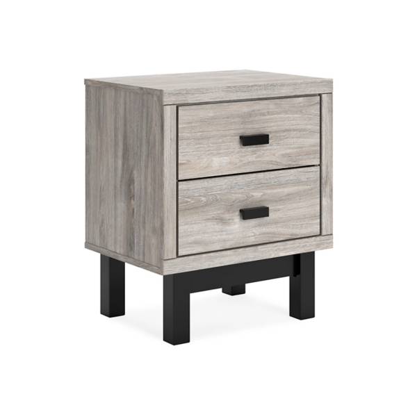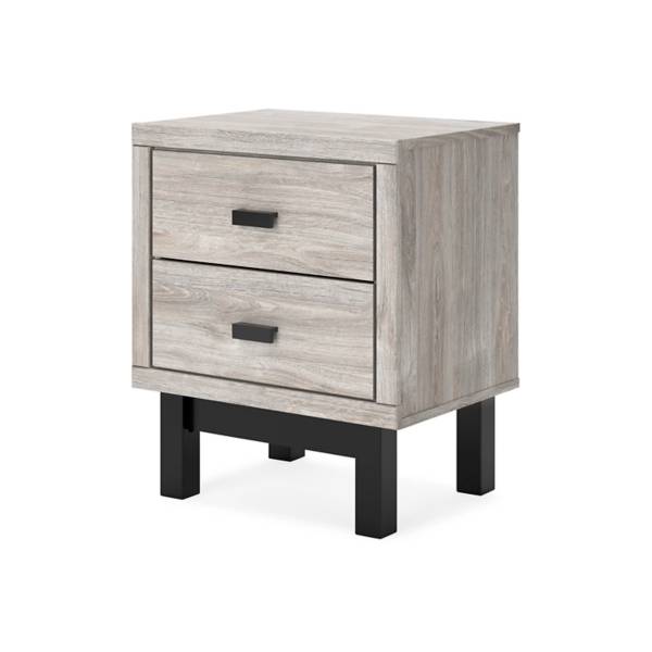 Elevate your bedroom with the sleek sophistication of the Vessalli Two Drawer Nightstand, available exclusively at Teletime. Designed to deliver contemporary luxury without compromise, this nightstand strikes a perfect balance between refined style and everyday practicality. Its two-tone palette features a light gray finish over replicated oak grain, beautifully contrasted by a matte black base with subtle woodgrain texture—bringing a modern, high-end aesthetic to your space at an affordable price.