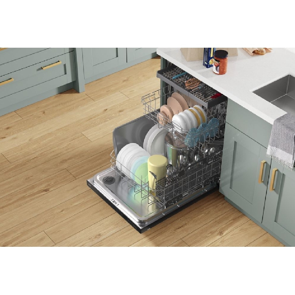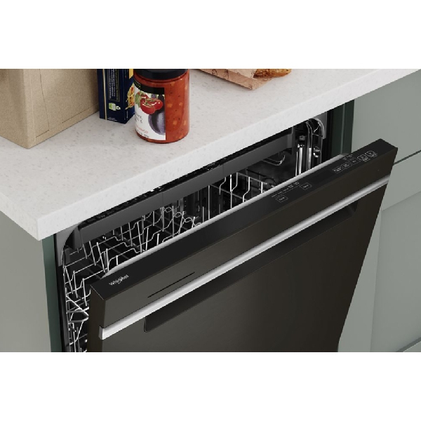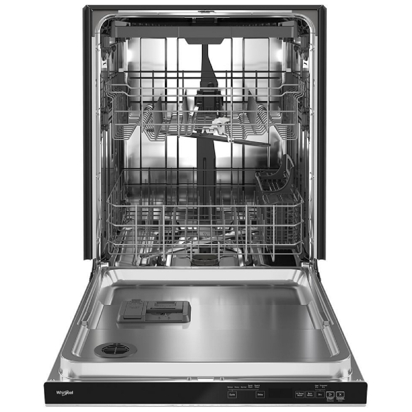Introducing the Whirlpool WDTA50SAKV Dishwasher, a sophisticated addition to your kitchen with its black stainless steel finish and seamless, fully integrated design. This 24-inch dishwasher combines advanced features with a whisper-quiet 47 dB decibel level, ensuring efficient cleaning without the noise.
