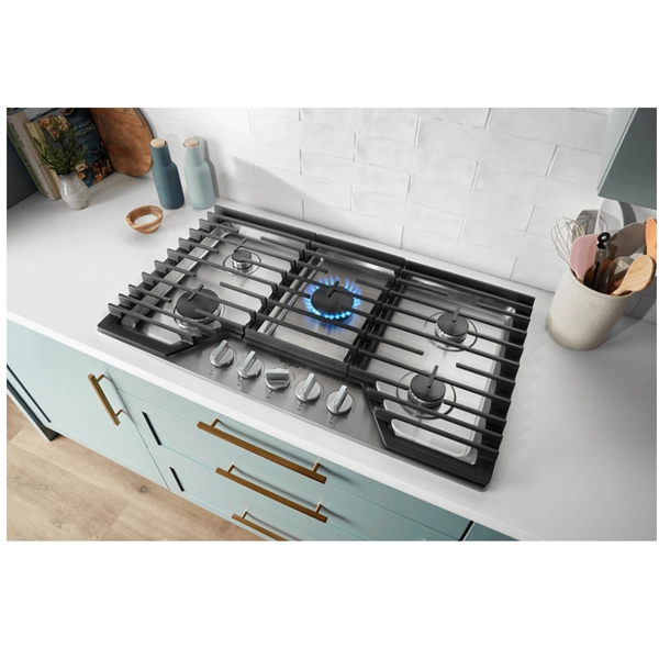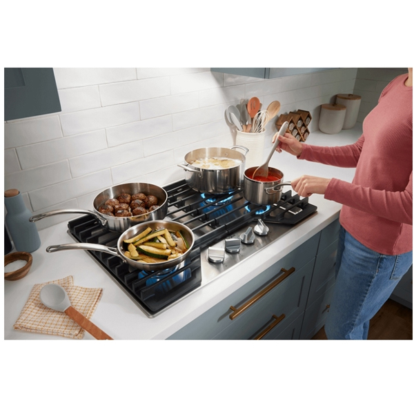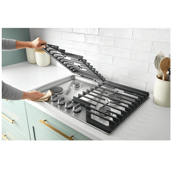 The cooktop is designed with convenience in mind. The EZ-2-Lift™ Hinged Cast-Iron Grates make it easy to access spills without removing heavy grates, while the edge-to-edge cast-iron grates maximize the cooking area, providing ample space to move pots and pans. Both the grates and control knobs are dishwasher-safe, simplifying cleanup after cooking.