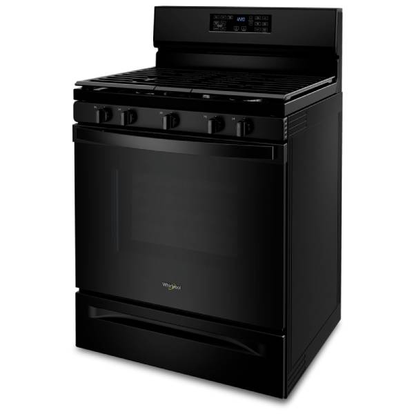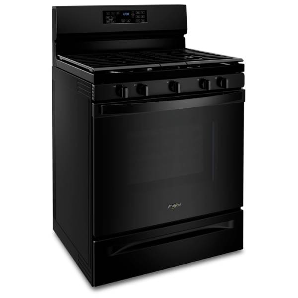 Whirlpool WFG550S0LB Gas Range, featuring a sleek 30-inch exterior width, Self Clean, Convection, 5 Burners, and a spacious 5.0 cu. ft. capacity. Designed with a convenient Storage Drawer and Air Fry function, this gas range comes with 1 oven and a bold black finish.