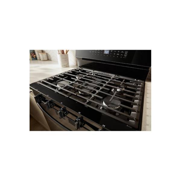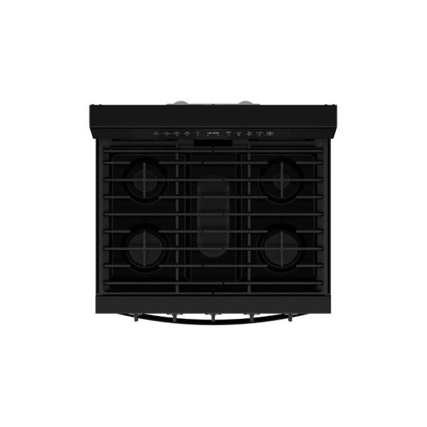 Whirlpool WFGS7530RB Gas Range, featuring a stylish 30-inch exterior width, Self Clean function, 5 powerful burners, and a spacious 5.3 cu. ft. oven capacity. Complete with a convenient storage drawer and a sleek black finish, this range is designed to elevate your kitchen’s functionality and aesthetic.