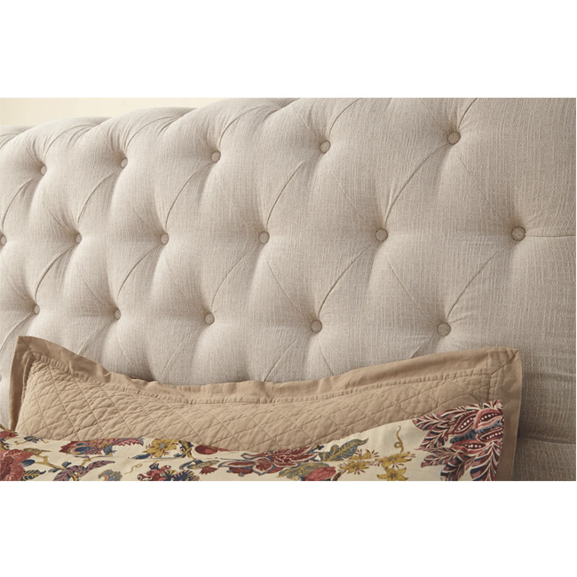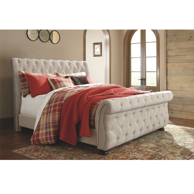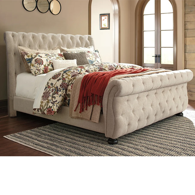 The Willenburg king upholstered bed combines grandeur and comfort, featuring an elegantly rolled headboard and footboard with button tufting. Its neutral linen fabric easily complements any décor, while bun feet add a refined touch. Mattress and foundation/box spring sold separately.