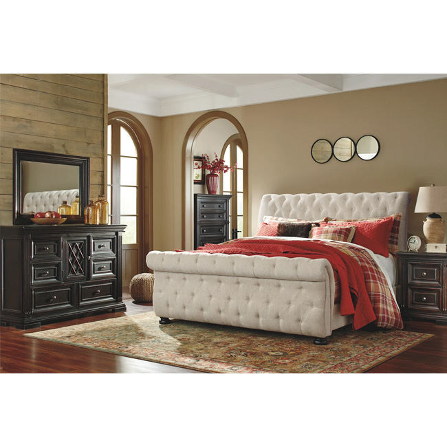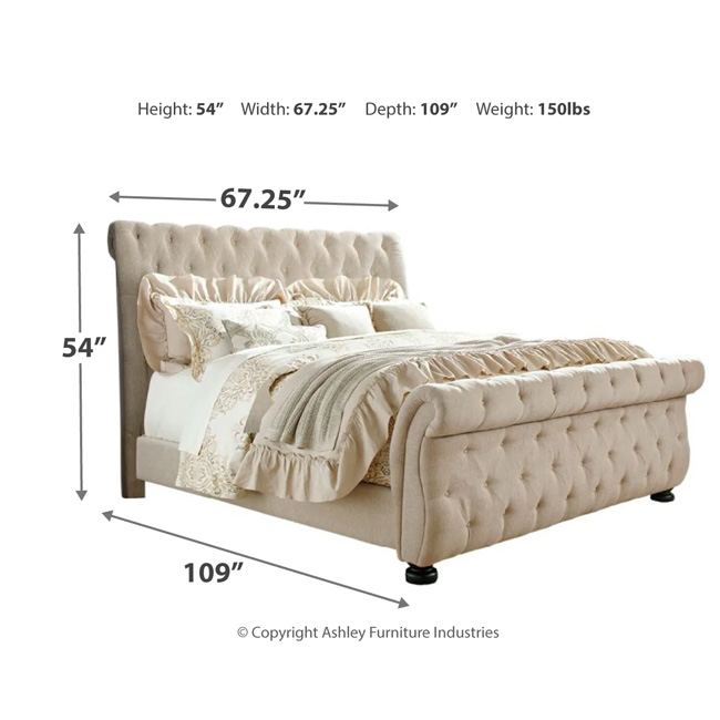 The Willenburg queen upholstered bed exudes elegance and sophistication with its rolled headboard and footboard, accented by classic button tufting. Its neutral linen upholstery is versatile, effortlessly complementing any bedding style. Mattress and foundation/box spring sold separately.