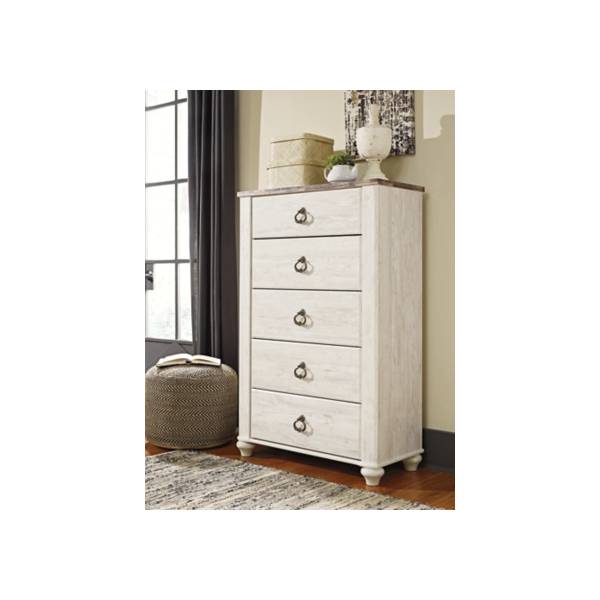 Designed with safety in mind, the Willowton Five Drawer Chest meets the latest ASTM F 2057 stability standards, making it a secure and family-friendly choice. The drawers fully extend, providing easy access to the entire interior while maintaining stability and safety. Whether you're looking to revamp your bedroom decor or simply need a practical storage solution, this chest combines timeless style and functionality effortlessly. Discover the perfect blend of elegance and utility exclusively at Teletime.
