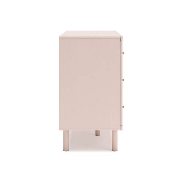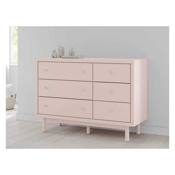 The Wistenpine Six Drawer Dresser strikes the perfect balance between modern aesthetics and functional design. Its subtle blush finish, paired with the soft warmth of a replicated pecan wood grain, brings a playful yet charming vibe to any child’s bedroom. Crafted with a combination of engineered wood, including MDF, particleboard, and plywood, this dresser ensures durability without compromising affordability.