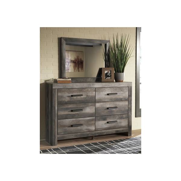 The Wynnlow Dresser and Mirror set exudes rustic sophistication with its weathered gray finish and clean-lined design. Spacious drawers offer practical storage, while the coordinating mirror enhances both functionality and style. A perfect blend of modern aesthetics and farmhouse charm.