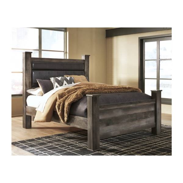 Introducing the Wynnlow Queen Upholstered Poster Bed, available exclusively at Teletime—a masterpiece that redefines modern rustic elegance. This queen bed combines a minimalist aesthetic with the warmth of rustic design, creating a sophisticated centerpiece for your bedroom. Its clean, contemporary lines are complemented by a striking replicated oak grain, featuring thick plank styling and a weathered gray finish that exudes authentic character.