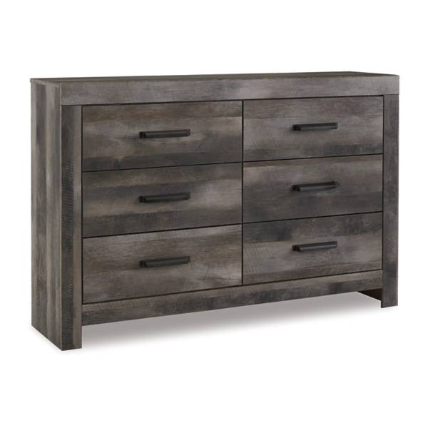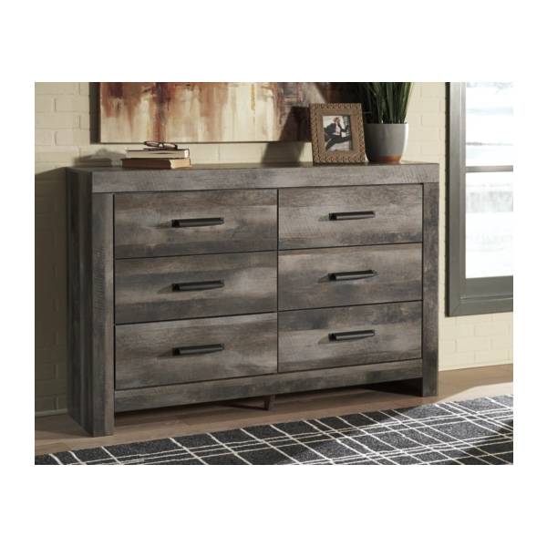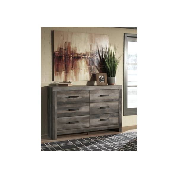 The Wynnlow Six Drawer Dresser offers spacious storage with six smooth-gliding drawers, providing ample room for your belongings. Its durable construction is crafted from engineered wood with a rustic gray finish over replicated oak grain, ensuring longevity.