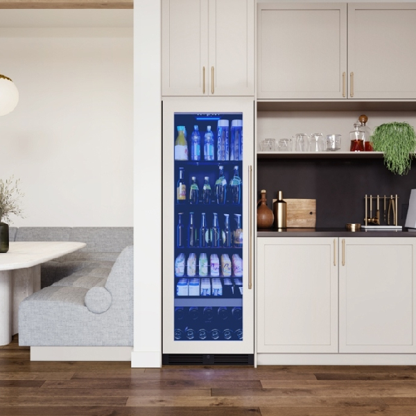 Elevate your home entertaining with this versatile and stylish Full Size Panel Ready Beverage Cooler. Designed to harmonize seamlessly with your cabinetry, it offers ample storage for your favorite wines and other beverages. Key features include Hettich articulating hinges, a Full-Extension Wood Rack, a Full-Extension Rollout Bin, vertical LED light strips in three colors and four light levels, an illuminated control panel, and an updated kickplate with lock. Please note that the door handle is sold separately, and the wood panel is not included.