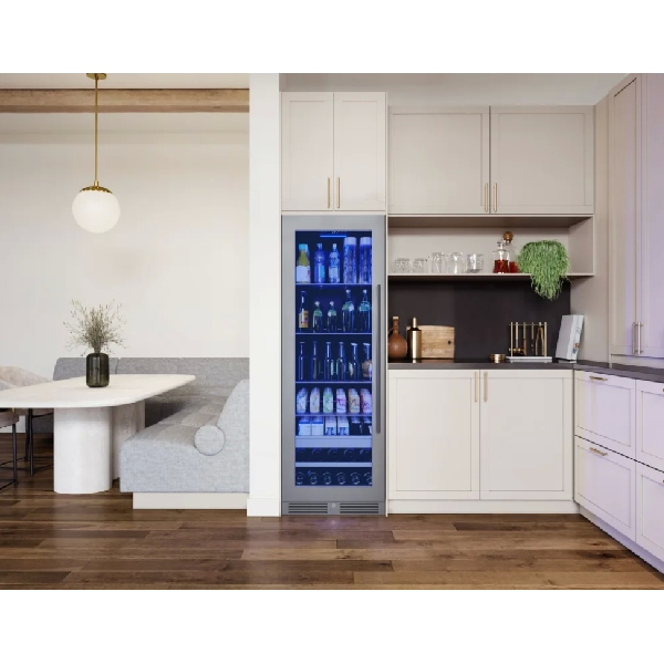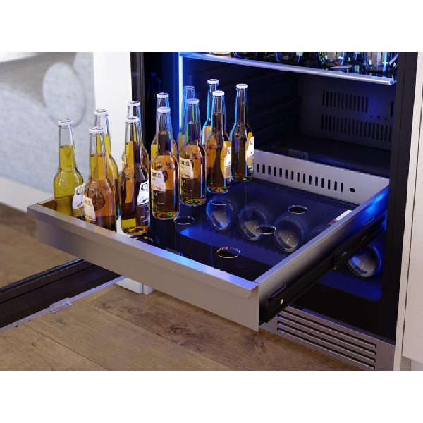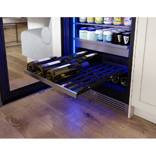 Whether it's wine, beer, soda, juice, or more, this beverage center ensures your beverages are always on hand and ready to enjoy. Featuring Full-Extension Wood Racks for bottle storage and a stainless steel Full-Extension Rollout Bin for easy access, convenience is at your fingertips.