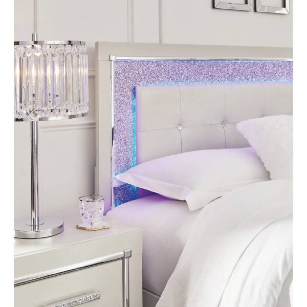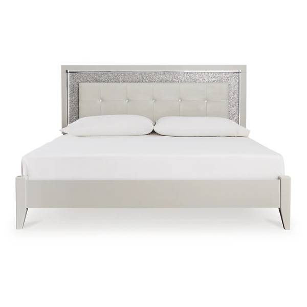 The Zyniden Queen Upholstered Panel Bed from Teletime brings a bold touch of luxury to your bedroom with its captivating design and glamorous details. This striking bed features tufted silver upholstery with a sophisticated faux alligator texture, perfectly complemented by glitter inlays and faceted chrome-tone accents. These exquisite details come together to create a bed that is both a statement piece and a symbol of opulence.