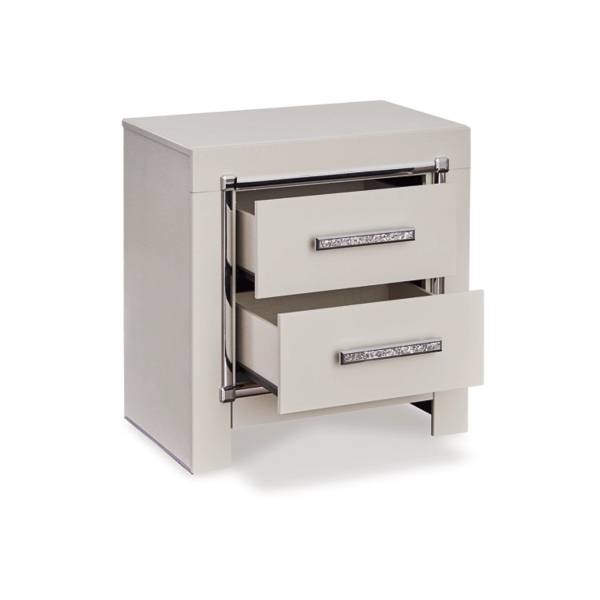 The elegant design is beautifully accented by faceted chrome-tone details and sparkling faux crystal-accented handles, adding a touch of opulence to your bedside ensemble. Built from engineered wood and finished with a high-quality decorative laminate, it blends affordability with lasting durability. The two smooth-gliding drawers provide ample storage for nighttime essentials, while faux linen-lined interiors keep everything looking neat and refined.